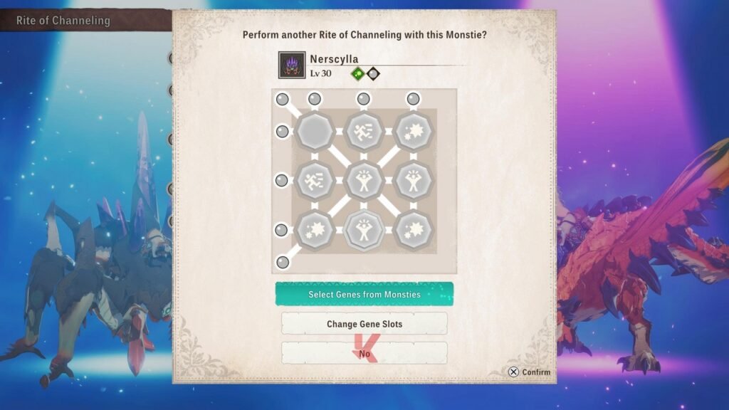 Dengan demikian, tidak sampai di sana saja, Monster Hunter Stories 3 juga memungkinkan Anda untuk memperkuat monster-monster andalan Anda lewat sebuah mekanik bernama Rite of Channeling. Konsepnya sederhana dan mudah dipahami. Dengan menggunakan board berisikan 9 nodes, Anda bisa memasangkan skill aktif dan buff dari monster lain ke monster Anda sesuai dengan yang Anda inginkan untuk membuat mereka lebih mematikan. Game juga akan memberikan bonus tertentu jika lewat papan 3×3 ini, Anda berhasil meracik bingo Anda baik dari kesamaan warna ataupun logo.